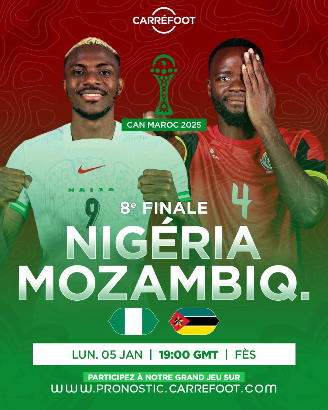 Ce lundi 5 janvier 2026, le Complexe Sportif de Fès accueille un huitième de finale aux allures de choc des extrêmes. Le Nigeria, impressionnant depuis le début de la compétition, affronte le Mozambique, la grande surprise de ces phases finales. Si les Super Eagles partent largement favoris, les Mambas comptent sur leur insouciance pour créer l’exploit.