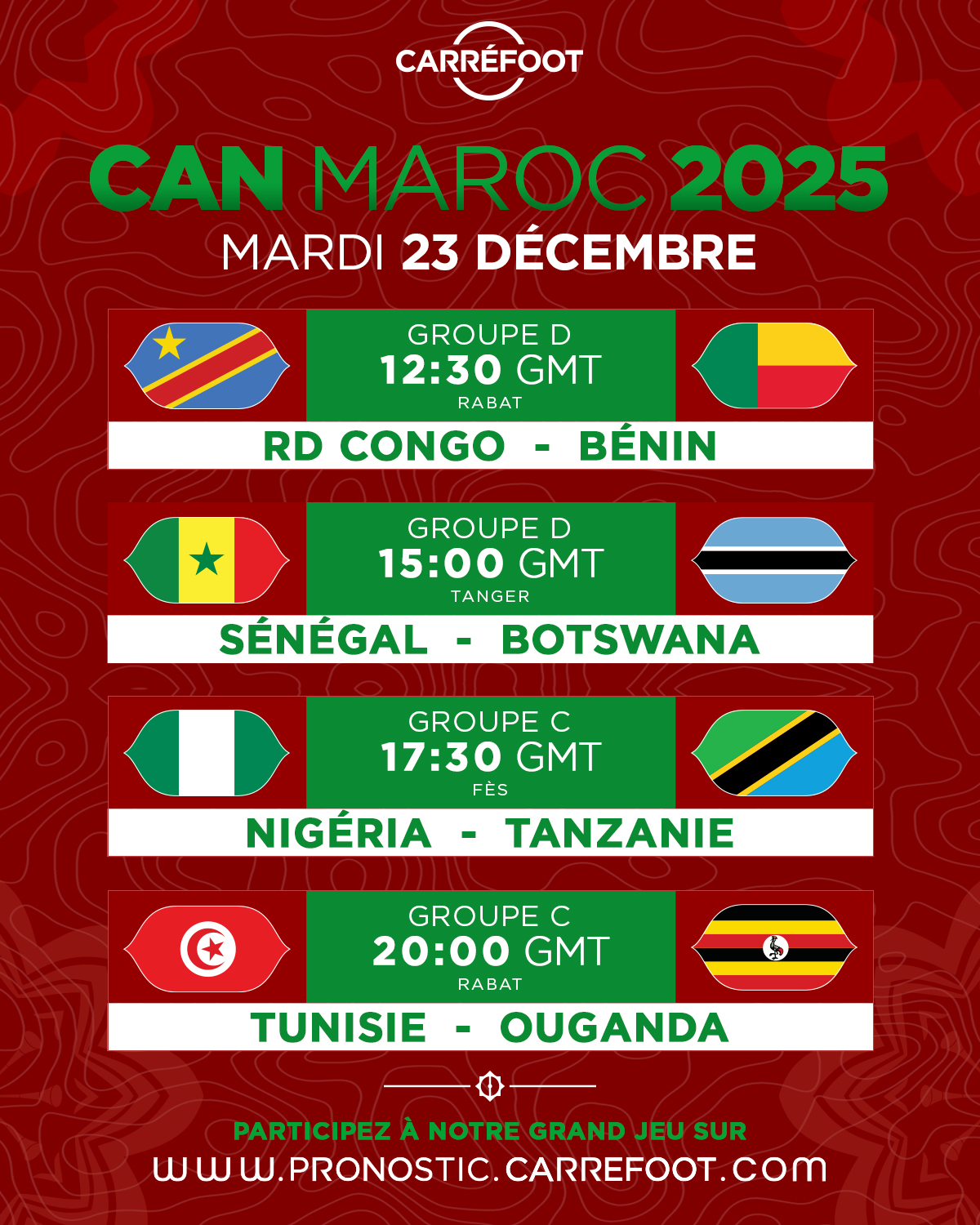 Ce mardi 23 décembre 2025, la Coupe d’Afrique des Nations monte en intensité au Maroc. Après les entrées en lice réussies des favoris des groupes A et B, c’est au tour des ténors des Groupes C et D de fouler les pelouses de Rabat, Tanger et Fès. Entre la solidité congolaise, la puissance sénégalaise et l’armada offensive nigériane, le programme promet des étincelles.
