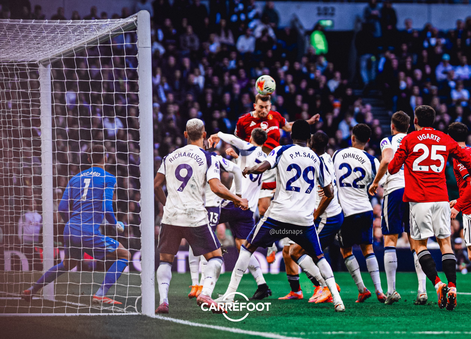 Ce match au sommet s’est achevé sur un score de parité. Bryan Mbeumo a ouvert le score pour les Reds Devils à la 32e. Sans abnégation, Tottenham renverse le score grâce à Mathys Tel (84e) et Richarlison (90e +1). Cependant, Manchester United a fait preuve de caractère en revenant au score (De Light, 90e +6) sur un corner.